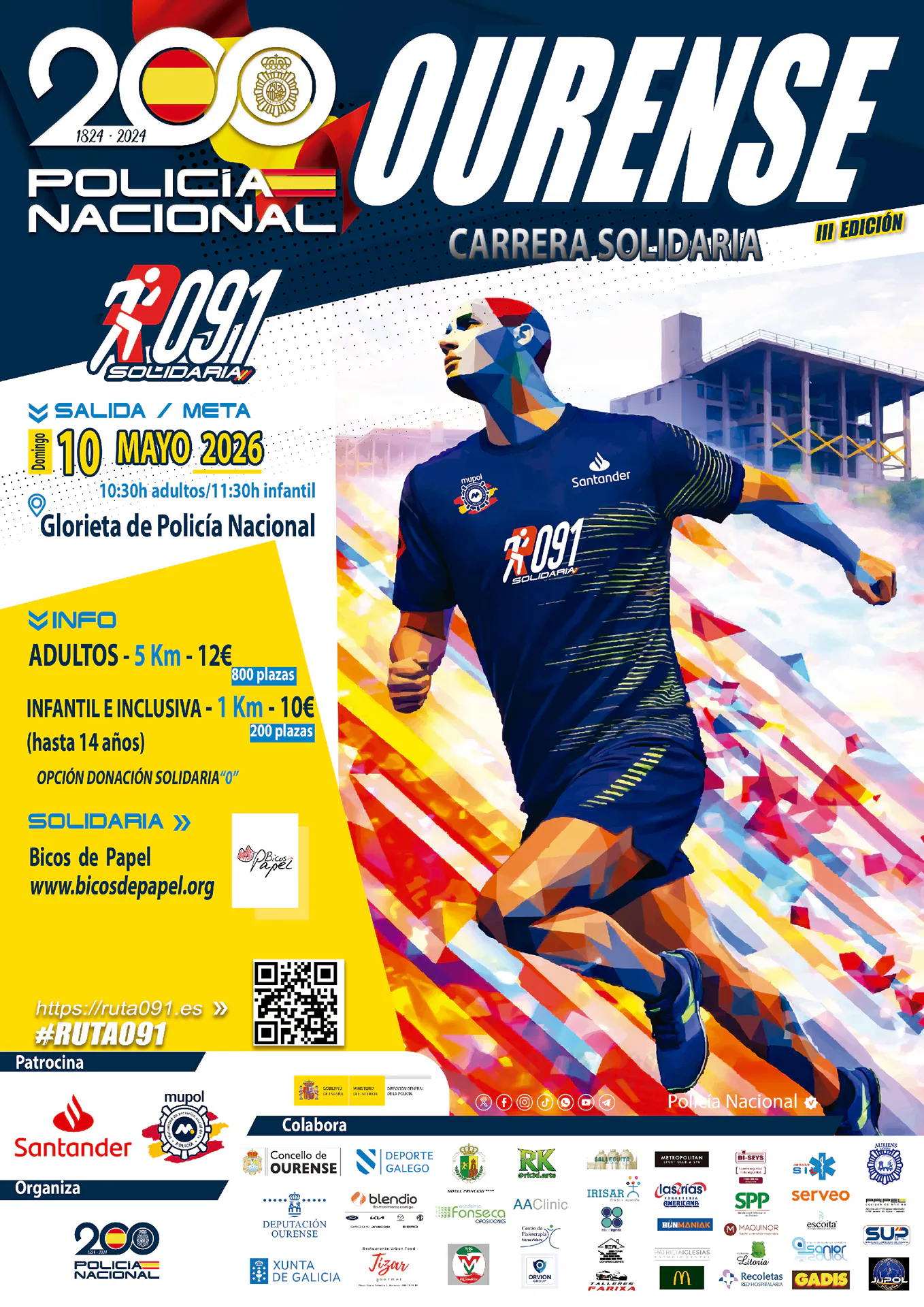 El próximo día 10 de mayo de 2026 la Comisaría Provincial de Ourense celebra la “III CARRERA-MARCHA SOLIDARIA RUTA 091” de Ourense, con fines benéficos a favor de la asociación sin ánimo de lucro “BICOS DE PAPEL” todo ello bajo la autorización y con la colaboración del Excelentísimo Ayuntamiento de Ourense.