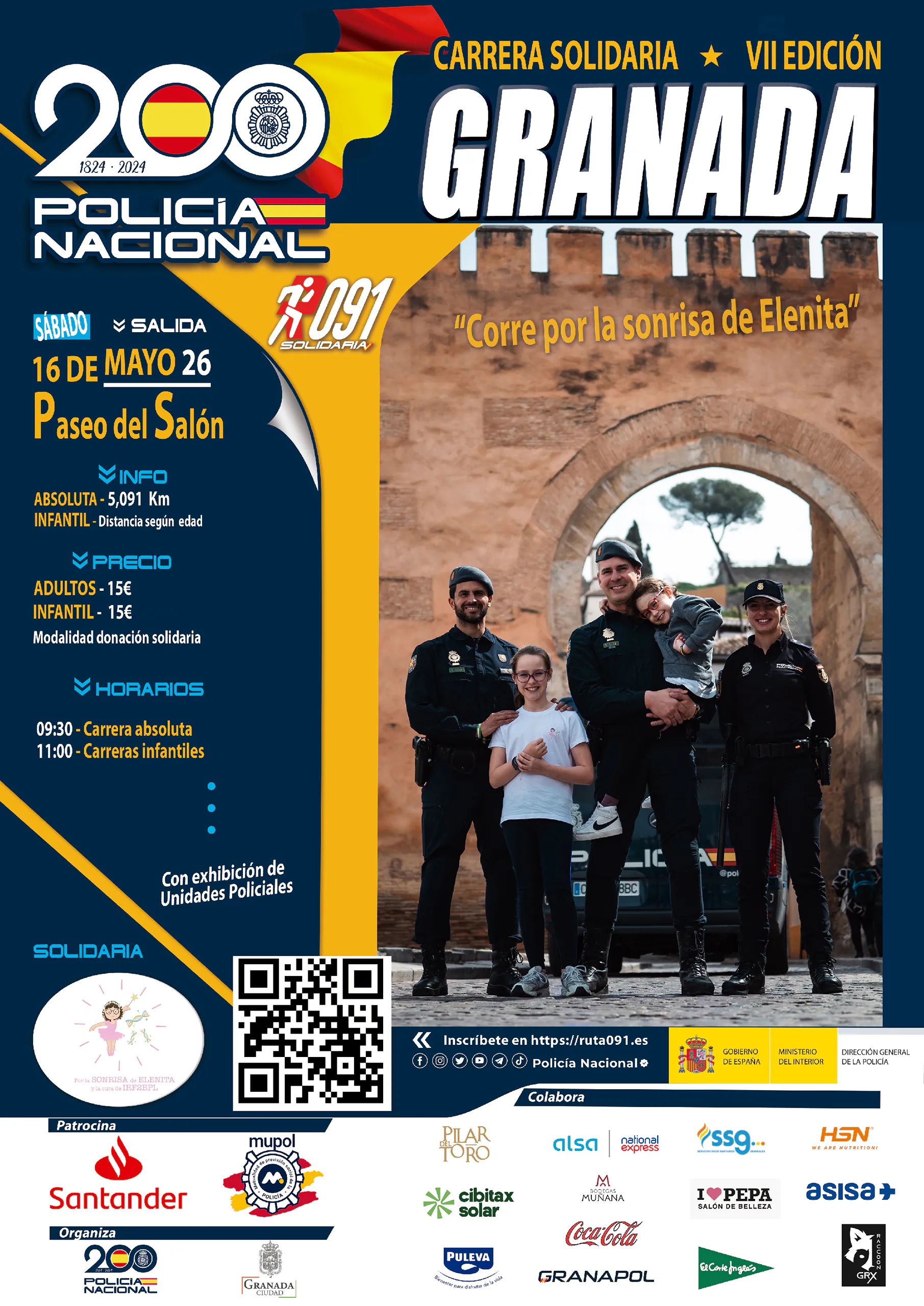 La VII Carrera Policial Ruta 091 es un evento deportivo y solidario organizado por la Policía Nacional en Granada, que se celebrará el 16 de mayo de 2026 bajo el lema “Corre por la sonrisa de Elenita”. Esta prueba tiene como objetivo fomentar la participación ciudadana en el deporte, promoviendo valores de inclusión, solidaridad y convivencia, al tiempo que recauda fondos en beneficio de la Asociación por la sonrisa de Elenita.