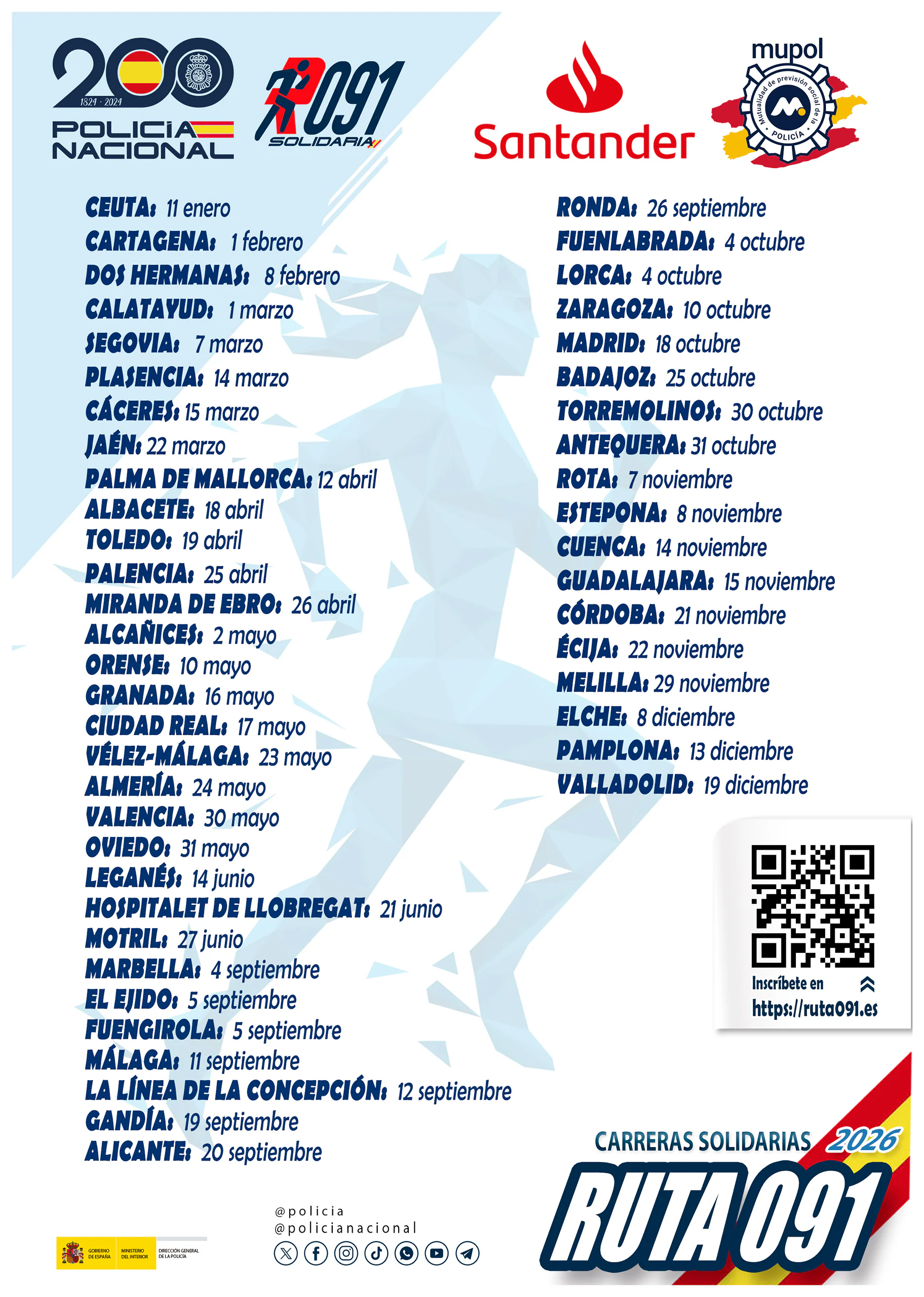 El 18 de octubre de 2026 la Dirección General de la Policía celebra la III Carrera Solidaria “Ruta 091” de Madrid bajo la autorización del Excelentísimo Ayuntamiento de Madrid. Todos los beneficios irán destinados a la entidad sin ánimo de lucro FUNDACIÓN CONTIGO CONTRA EL CÁNCER DE LA MUJER.