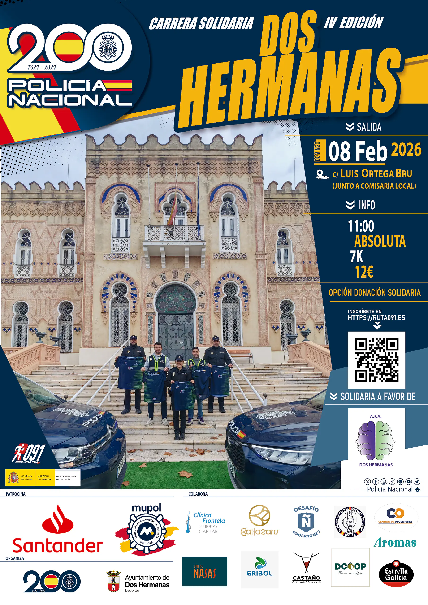 El domingo 8 de febrero de 2026, a las 11:00 horas, la Comisaría Local de Dos Hermanas organiza la IV Carrera Solidaria “Ruta 091” – Tesón de Hierro, bajo la colaboración del Ilmo. Ayuntamiento de Dos Hermanas, la Policía Local y Protección Civil.